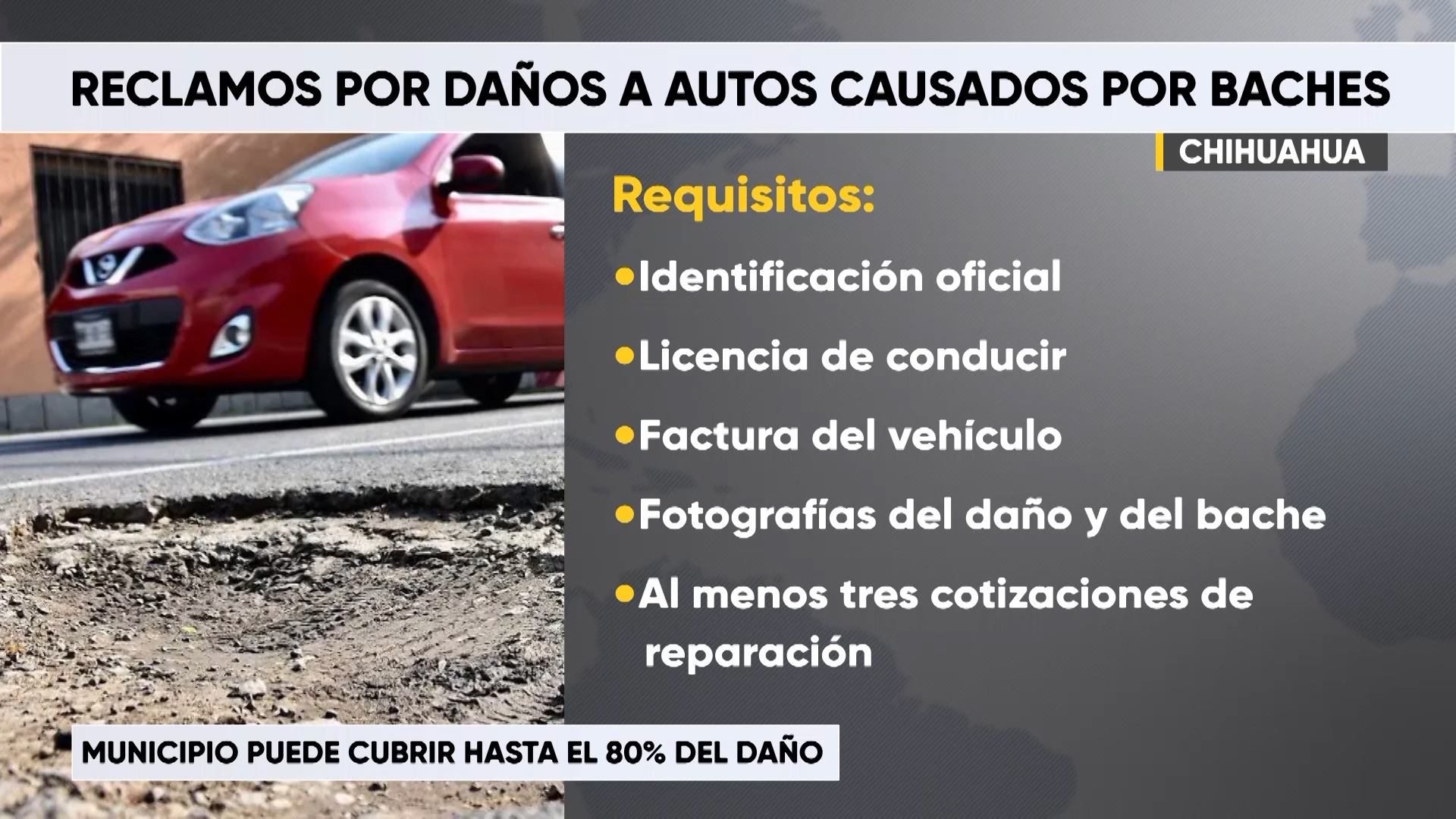 El afectado debe presentarse en la Oficialía Mayor, ubicada en el octavo piso del edificio del Real, con los siguientes documentos: identificación oficial, licencia de conducir, factura del vehículo, fotografías del daño y del bache, y tres cotizaciones de reparación.