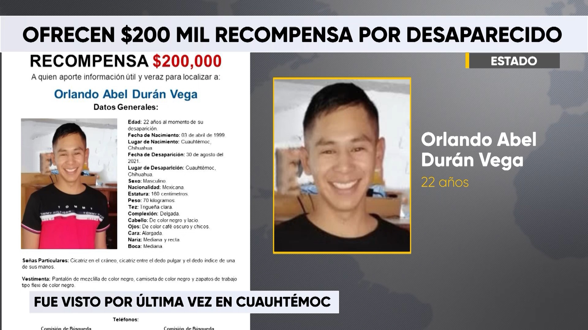 Chihuahua.- La Fiscalía General del Estado (FGE) ofrece una recompensa de 200 mil pesos a quien aporte información fidedigna que permita dar con el paradero de Orlando Abel Durán Vega, quien cuenta con reporte de desaparición desde el 30 de agosto de 2021 y fue visto por última vez en la ciudad de Cuauhtémoc.