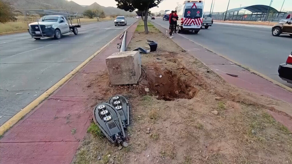 Debido a la magnitud del impacto, el automóvil derribó un poste de luminaria sobre el camellón tras dar la vuelta de campana.