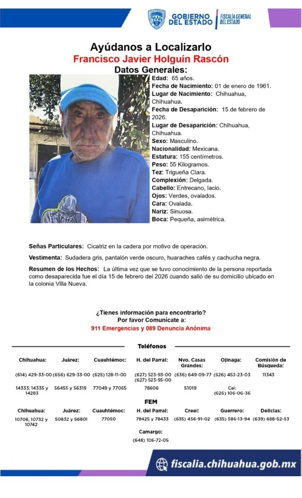 Chihuahua, Chih.- Se solicita la ayuda de la ciudadanía para localizar a Francisco Javier Holguín Rascón, quien fue visto por última vez el pasado 15 de febrero del 2026 en Chihuahua, Chihuahua.