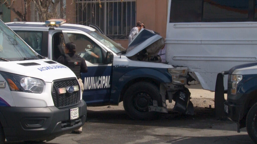 Chihuahua, Chih.- Dos oficiales de la Policía Municipal resultaron lesionadas luego de que la patrulla que tripulaban impactara la parte trasera de un autobús de transporte de personal de la empresa SOFI, estacionado en el cruce de las calles Mina y 72, en la colonia Cerro de la Cruz.