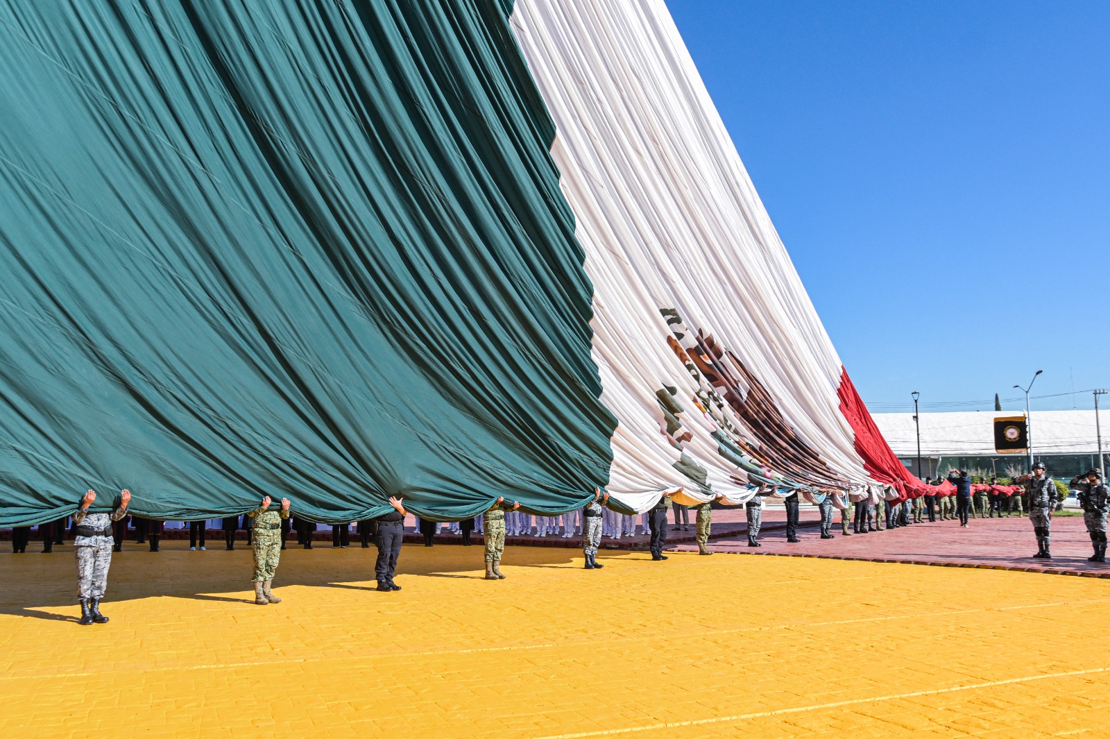 Chihuahua, Chih.- “La violencia y el crimen organizado no están representados en nuestra bandera”, afirmó la gobernadora María Eugenia Campos Galván durante la ceremonia de izamiento de la bandera monumental en el parque El Palomar, para conmemorar al lábaro patrio.