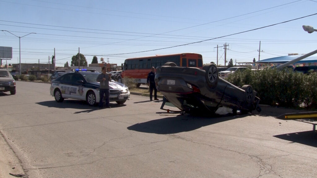 Chihuahua, Chih.- Un padre y su hija resultaron lesionados luego de volcar su automóvil Honda Civic al chocar contra una luminaria en el cruce de las calles Sosa Vera y Avenida de los Portales, a un costado del fraccionamiento Villa del Real.