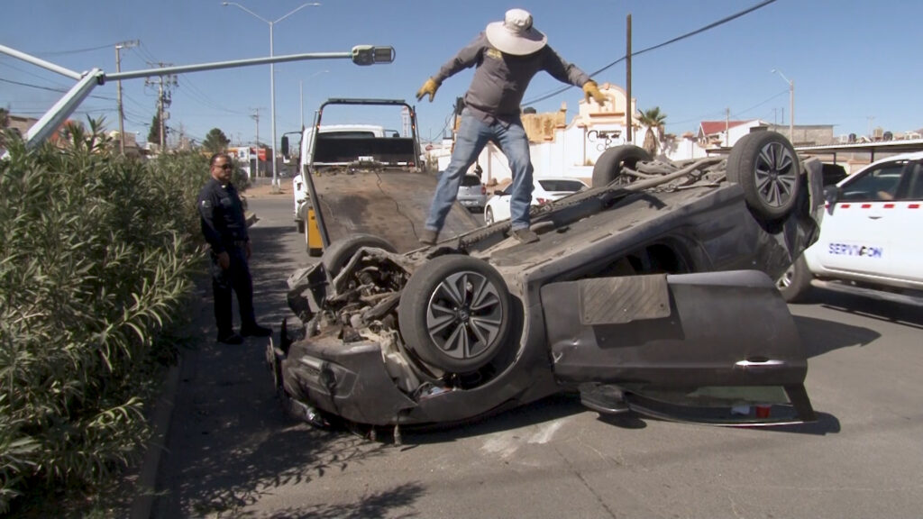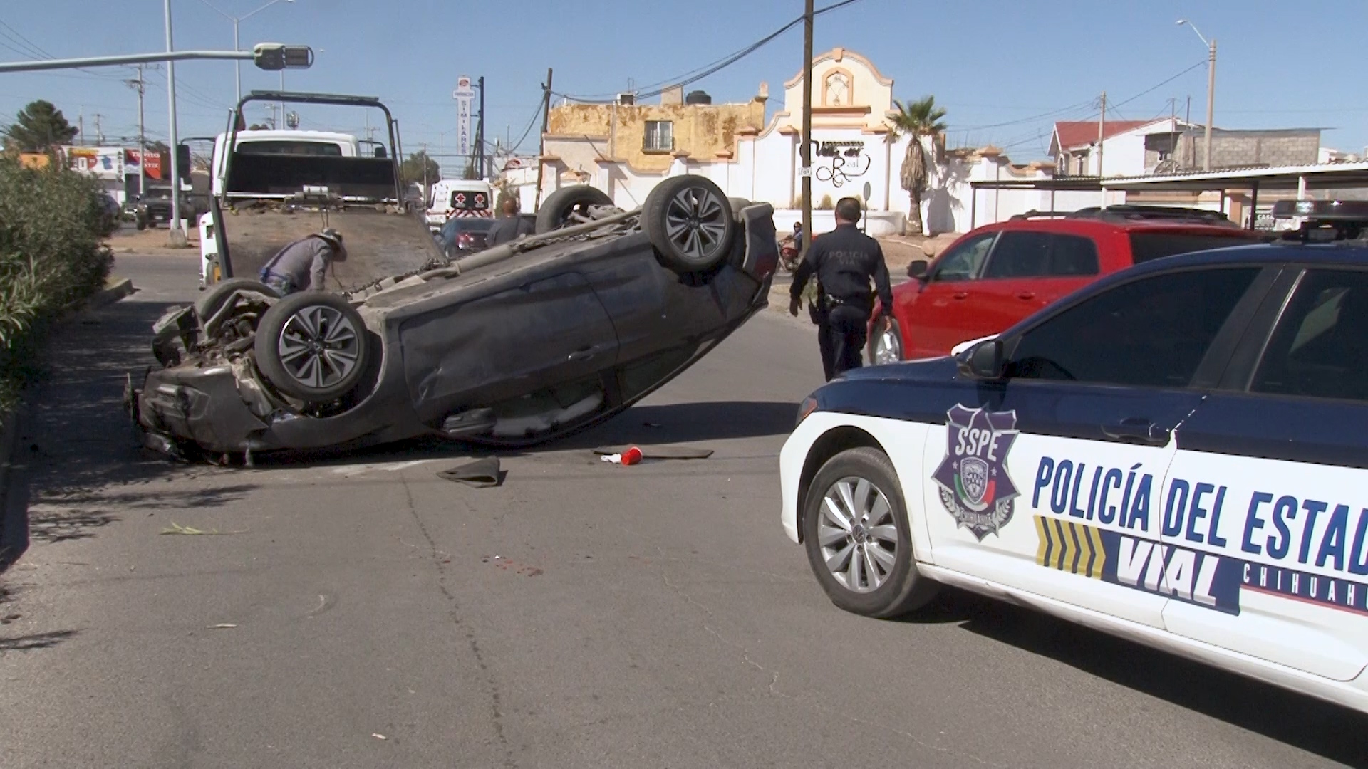 Chihuahua, Chih.- Un padre y su hija resultaron lesionados luego de volcar su automóvil Honda Civic al chocar contra una luminaria en el cruce de las calles Sosa Vera y Avenida de los Portales, a un costado del fraccionamiento Villa del Real.