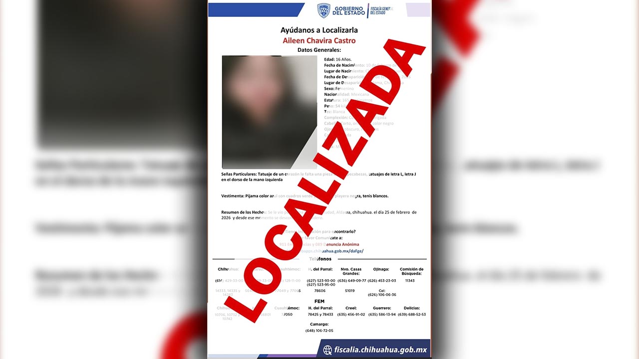 Chihuahua.- Elementos de la Agencia Estatal de Investigación, adscritos a la Fiscalía de Distrito Zona Centro en la Unidad de Investigación del municipio de Aldama, localizaron sana y salva a la adolescente de iniciales A. C. C., de 16 años de edad.