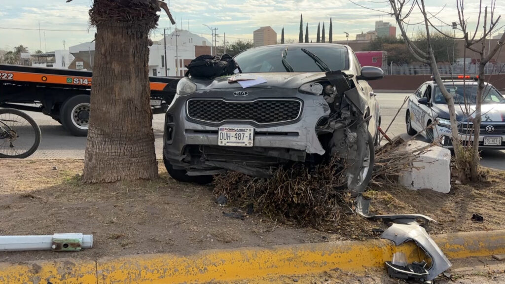 Chihuahua, Chih.- La conductora de una camioneta KIA gris chocó contra un poste de alumbrado y una palmera en el cruce de Teófilo Borunda con calle Décima, junto al Palomar, al intentar esquivar a un conductor que omitió un alto.
