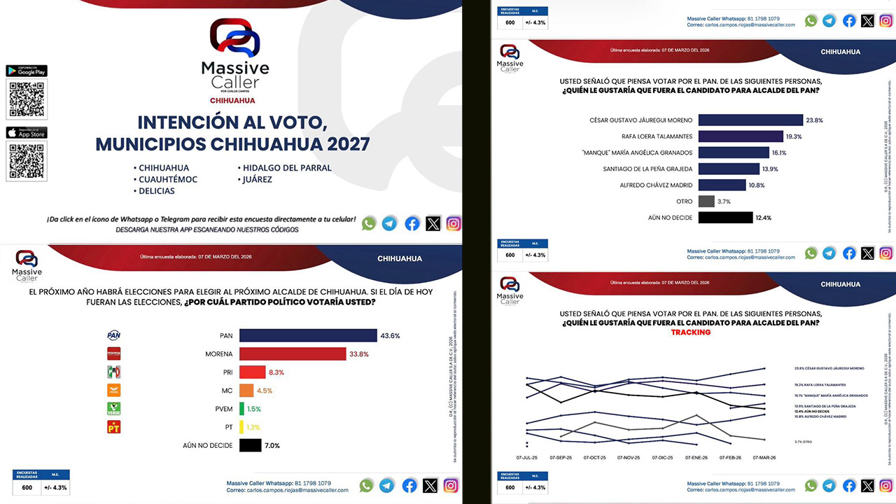 La medición de Massive Caller se realizó con 600 encuestas, con un margen de error de ±4.3%, y forma parte de un seguimiento periódico sobre las preferencias rumbo a la definición de candidaturas municipales.
