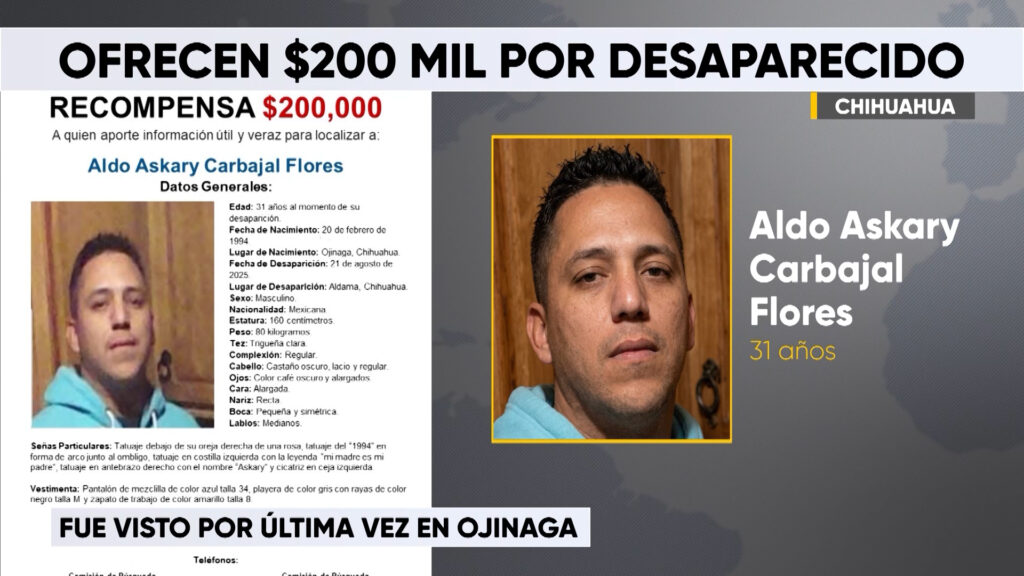 Aldama, Chih.- La Fiscalía General del Estado ofrece una recompensa de 200 mil pesos a quien proporcione información útil, veraz y oportuna que contribuya a localizar a Aldo Askary Carbajal Flores, reportado como desaparecido.