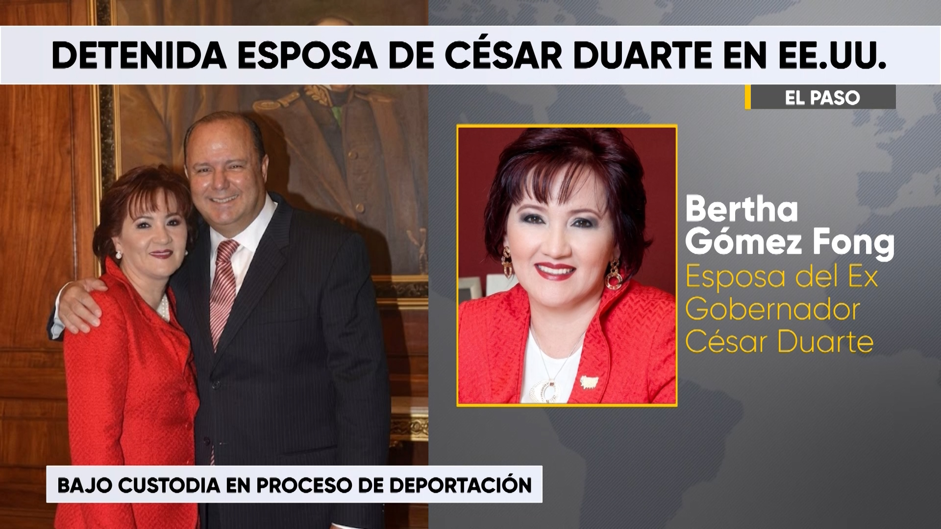 El Paso, TX.- Bertha Olga Gómez Fong, ex presidenta del DIF Estatal de Chihuahua y esposa del exgobernador César Duarte Jáquez, fue detenida en El Paso, Texas, por agentes del Servicio de Inmigración y Control de Aduanas, debido a problemas con su estatus legal en Estados Unidos.