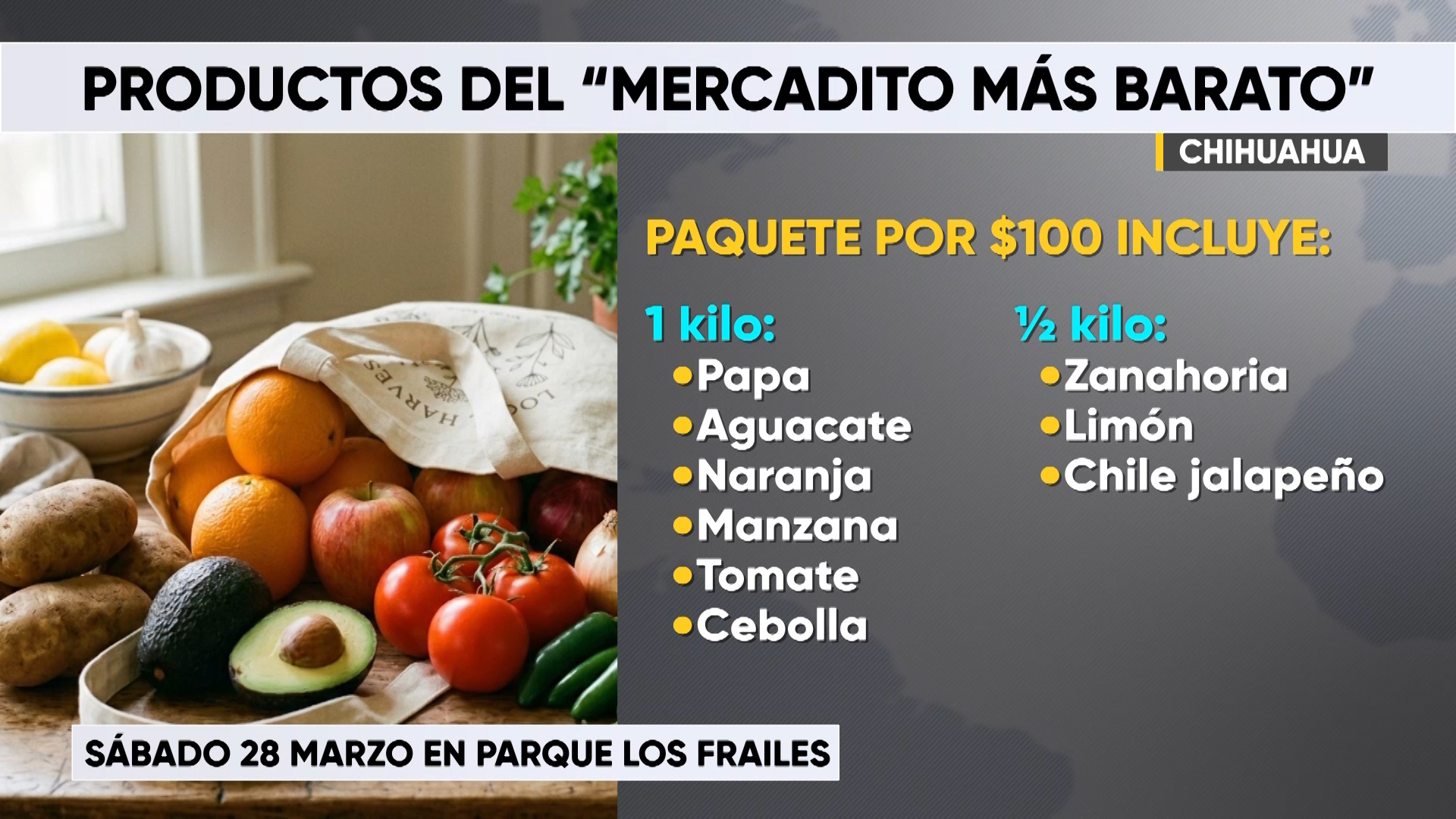 Chihuahua.- El “Mercadito más barato” ofrecerá paquetes de la canasta básica con un costo de 100 pesos, que incluirán un kilogramo de papa, aguacate, naranja, manzana, tomate y cebolla, así como medio kilogramo de zanahoria, limón y chile jalapeño.