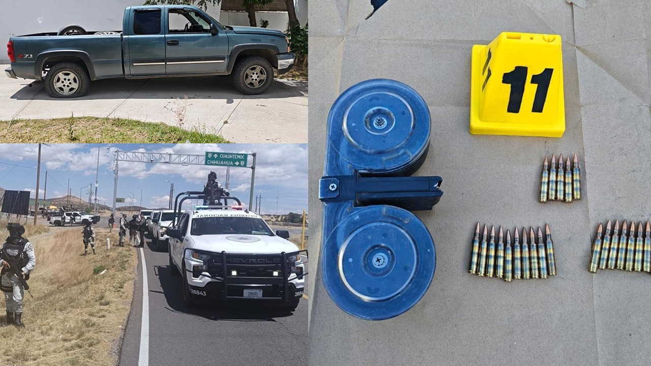 La pick up asegurada es de la marca Chevrolet, línea Silverado, cabina y media, color gris, sin placas de circulación la cual no cuenta con reporte de robo, en su interior se localizó un cargador con 31 cartuchos útiles, calibres .223 y otro cargador de disco con 25 tiros útiles, también calibre .223mm.