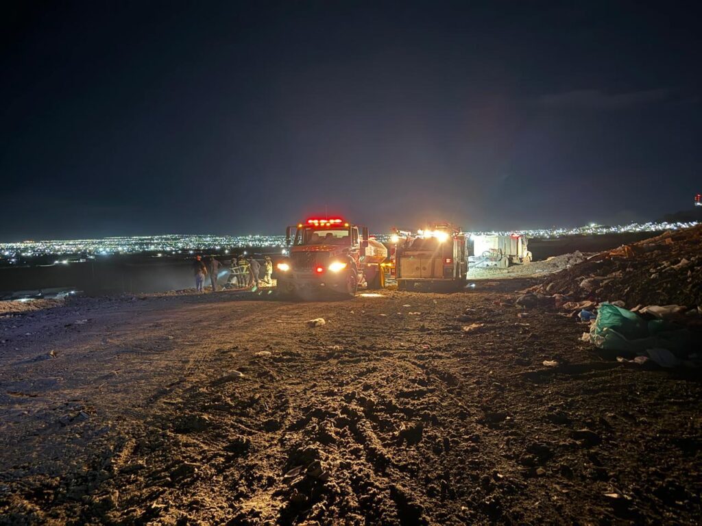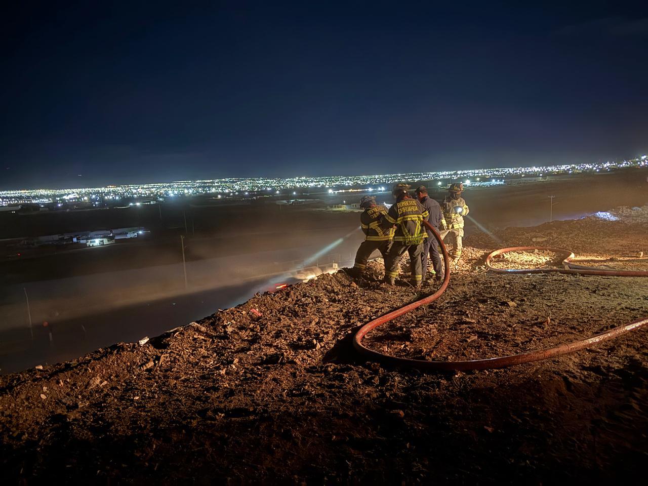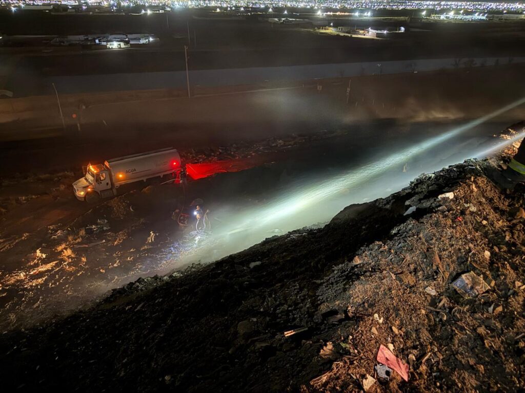 Chihuahua, Chih.- Elementos del Cuerpo de Bomberos controlaron y extinguieron un incendio registrado en la celda 2 del relleno sanitario durante la noche de este viernes 17 de abril, con apoyo de personal de Servicios Públicos Municipales.
