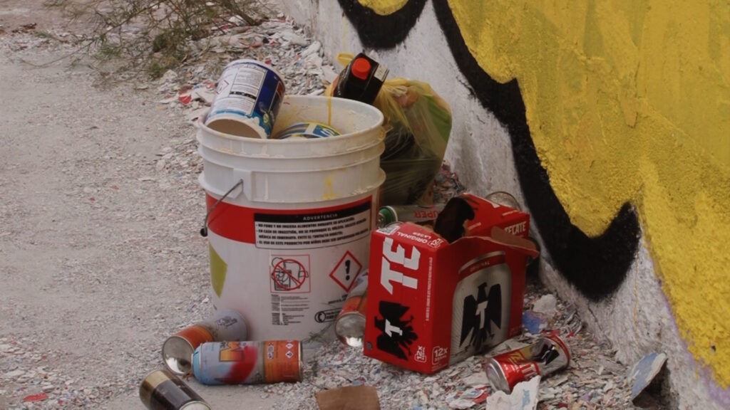 En el lugar quedaron latas y botellas de cerveza que fueron consumidas en la vía pública por los involucrados en la elaboración del mural.