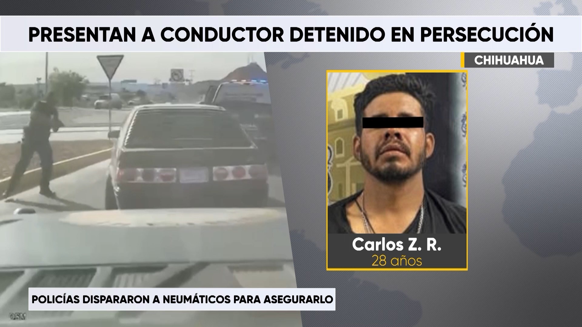 Chihuahua.- Carlos Z. R., de 28 años de edad, fue detenido por elementos de la Dirección de Seguridad Pública Municipal y posteriormente presentado por su presunta responsabilidad en el delito de posesión de vehículo con reporte de robo, tras una persecución en la que los agentes realizaron detonaciones para lograr su aseguramiento.