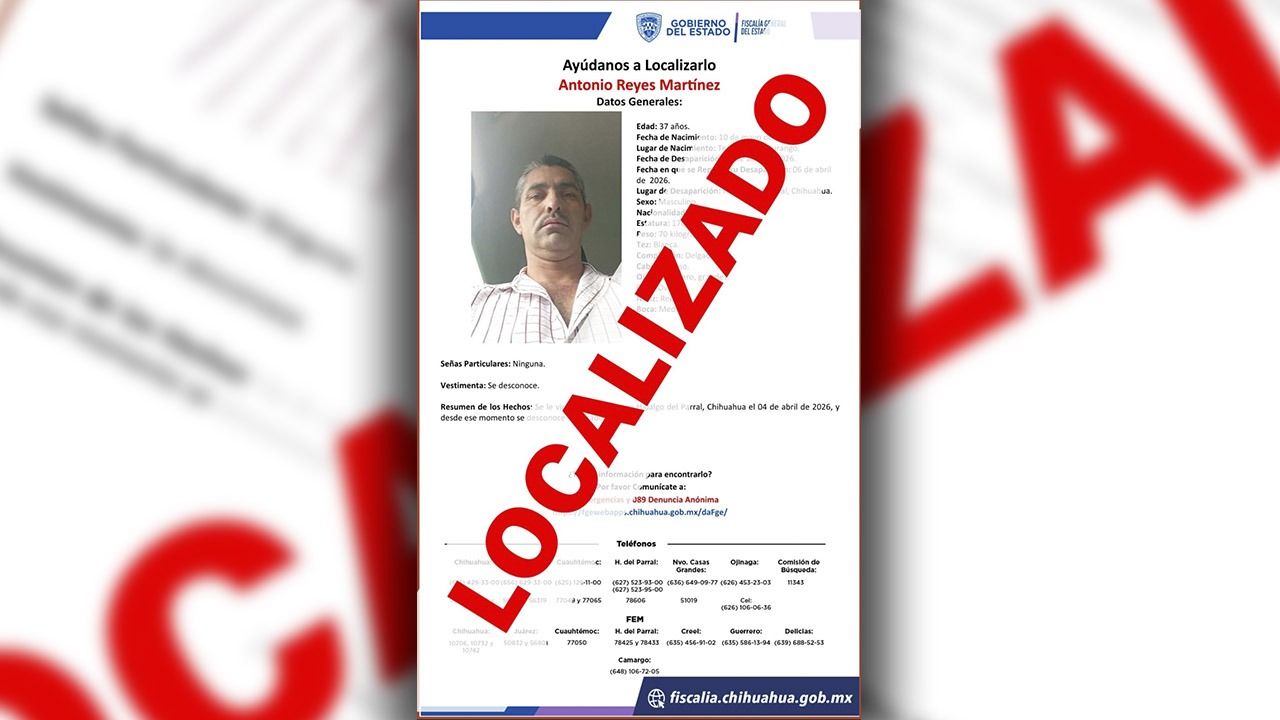 Chihuahua.- Derivado de la activación de los protocolos de búsqueda implementados por la Fiscalía de Distrito Zona Sur, se logró localizar sano y salvo a un masculino de nombre Antonio R. M., quien fue reportado como ausente el 06 de abril del presente año en la ciudad de Parral.