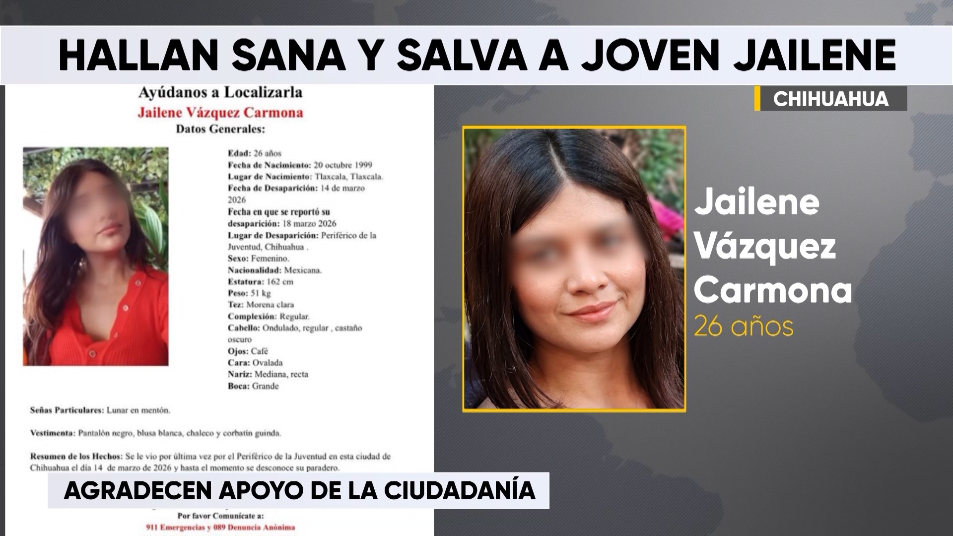 Chihuahua.- Jailene Vázquez Carmona, de 26 años, fue localizada sana y salva por personal ministerial de la Fiscalía Especializada de la Mujer.