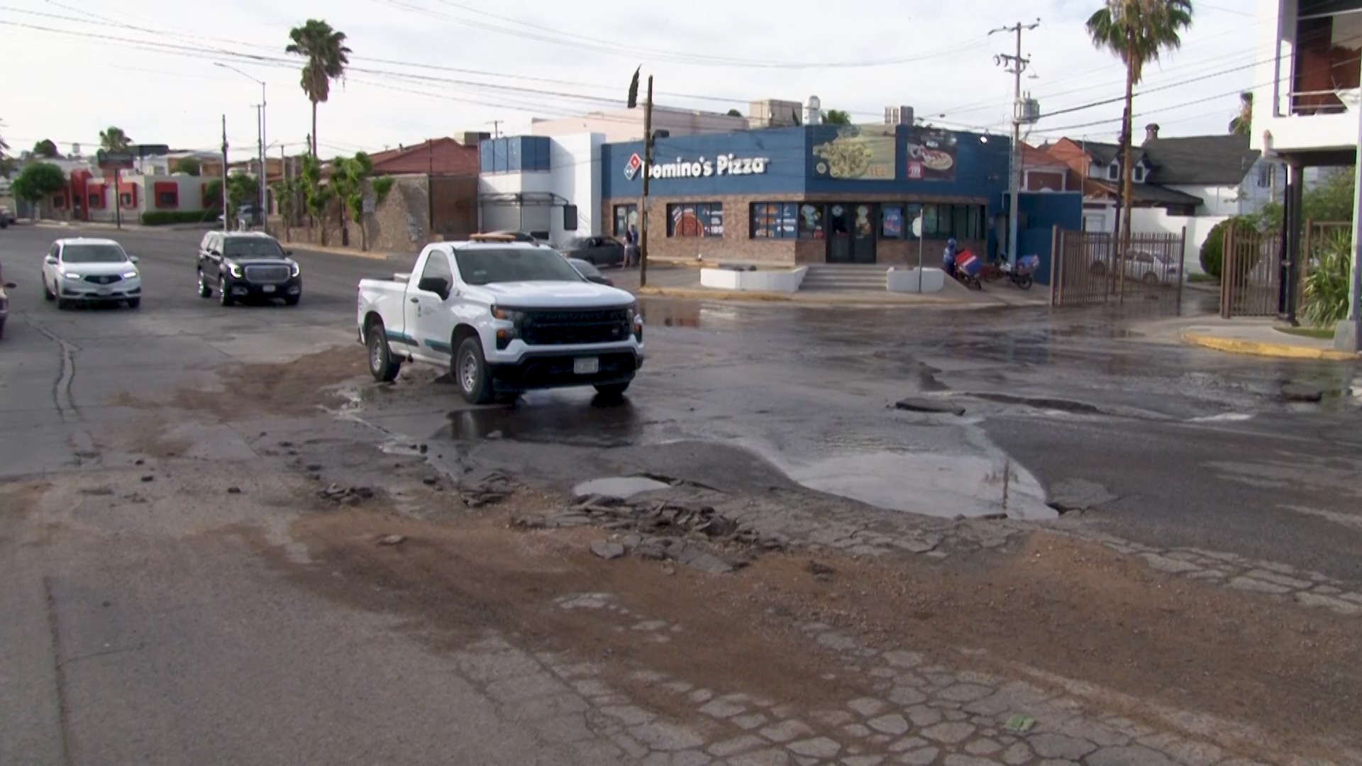 Chihuahua, Chih.- La explosión de una tubería de la Junta Municipal de Agua y Saneamiento generó una fuerte fuga de agua y diversos destrozos en el pavimento, entre ellos un socavón profundo, en el cruce de las calles Mirador y Louisiana, en la colonia Campestre.