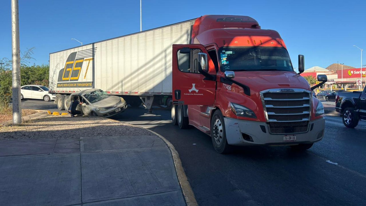 Chihuahua, Chih.- Un aparatoso accidente vial se registró en el cruce de la Avenida Homero y Avenida Tecnológico, cuando la conductora de un vehículo Nissan Tiida quedó prensada debajo de la caja de un tráiler. El incidente ocurrió en una de las curvas del “trébol” que conecta ambas arterias, luego de que la automovilista, una mujer de aproximadamente 45 años, intentara ganarle el paso a la unidad de carga.