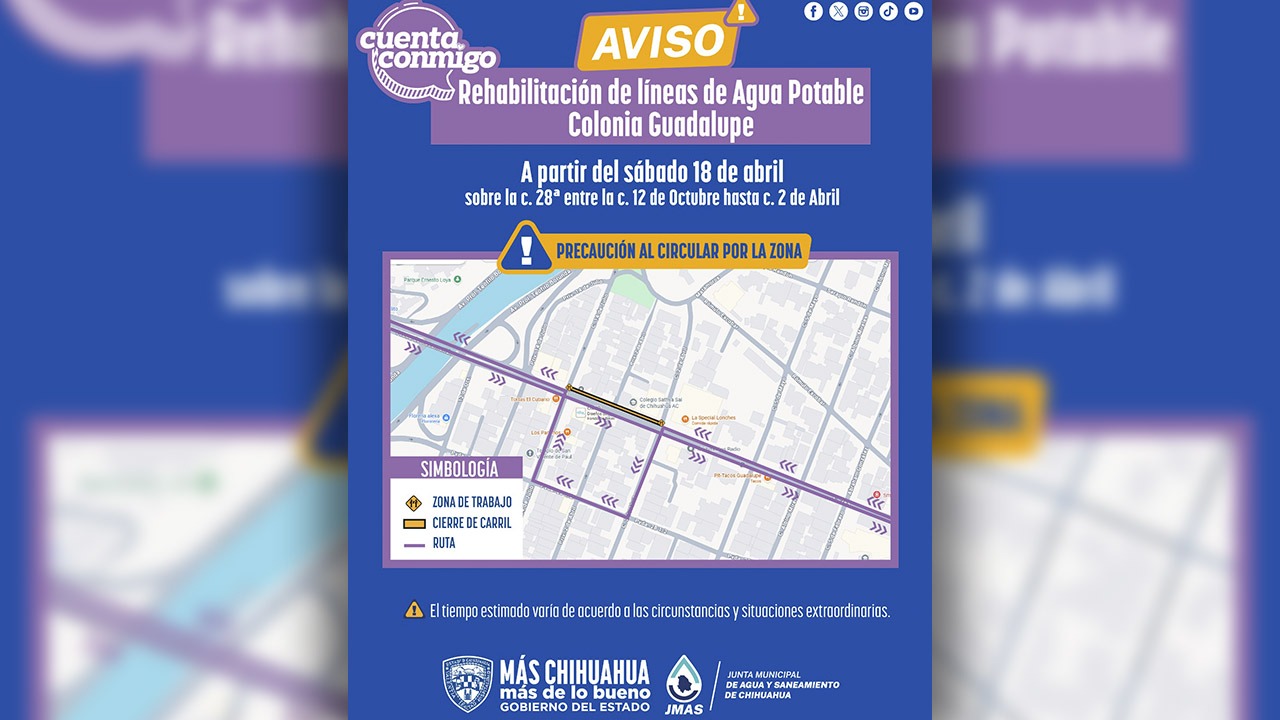 Chihuahua, Chih.- La Junta Municipal de Agua y Saneamiento (JMAS) de Chihuahua informa que este 18 de abril iniciará la rehabilitación de la línea de agua potable en la calle 28, entre 14 de Julio y 2 de Abril, en la colonia Guadalupe.