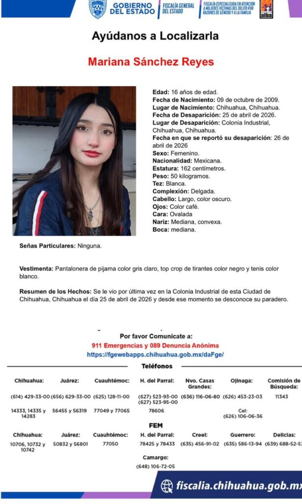 Chihuahua, Chih.- Se solicita la ayuda de la ciudadanía para localizar a Mariana Sánchez Reyes, quien fue vista por última vez el pasado 25 de abril del 2026, en la colonia Industrial, Chihuahua, Chihuahua.