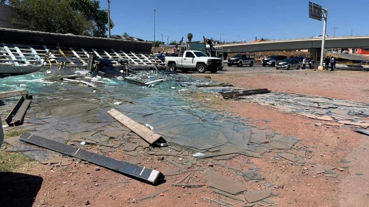 Chihuahua, Chih.- Al intentar realizar una maniobra de forma incorrecta, el chofer de un tráiler volcó la caja de su unidad, la cual transportaba aproximadamente 30 toneladas de vidrio. Los hechos ocurrieron en el cruce de la Prolongación Teófilo Borunda y la Vialidad Sacramento, a la altura de la colonia Popular.